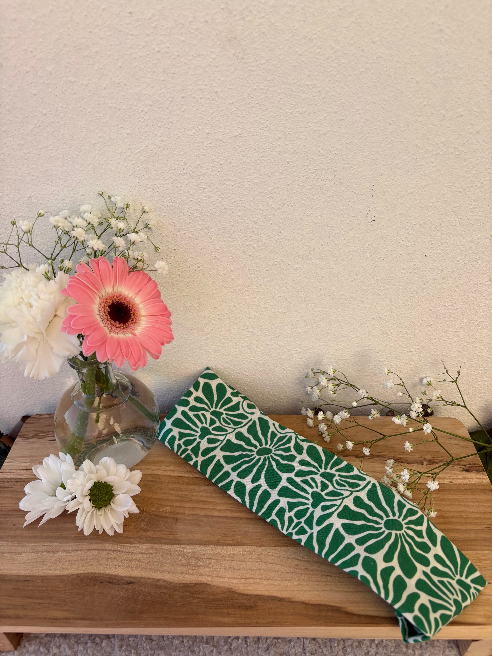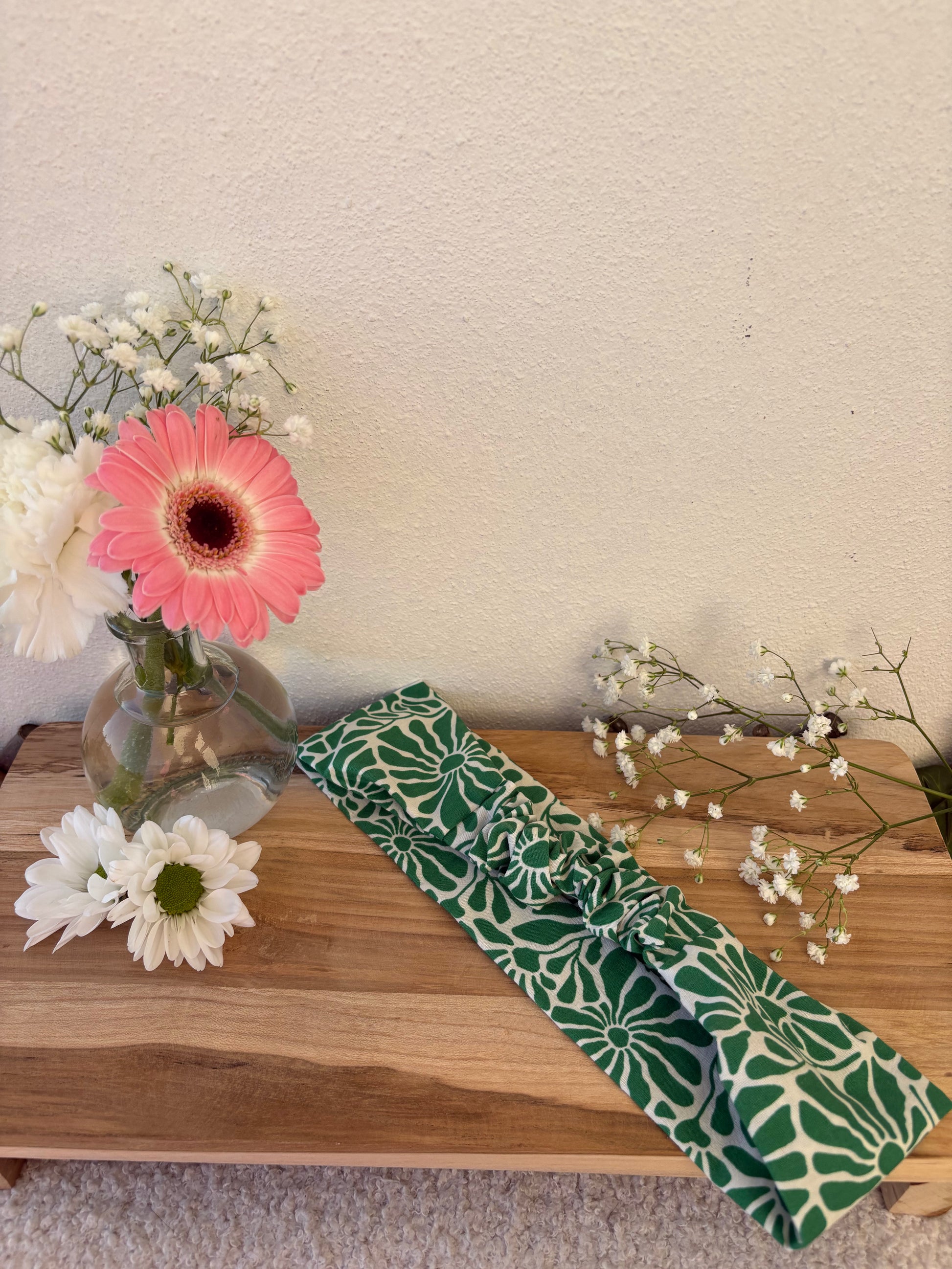 Évadez-vous dans un jardin sauvage avec le bandeau “Roxane”. Son imprimé floral vert intense sur fond écru évoque la nature luxuriante et les après-midis au soleil, cheveux au vent… 🌬️