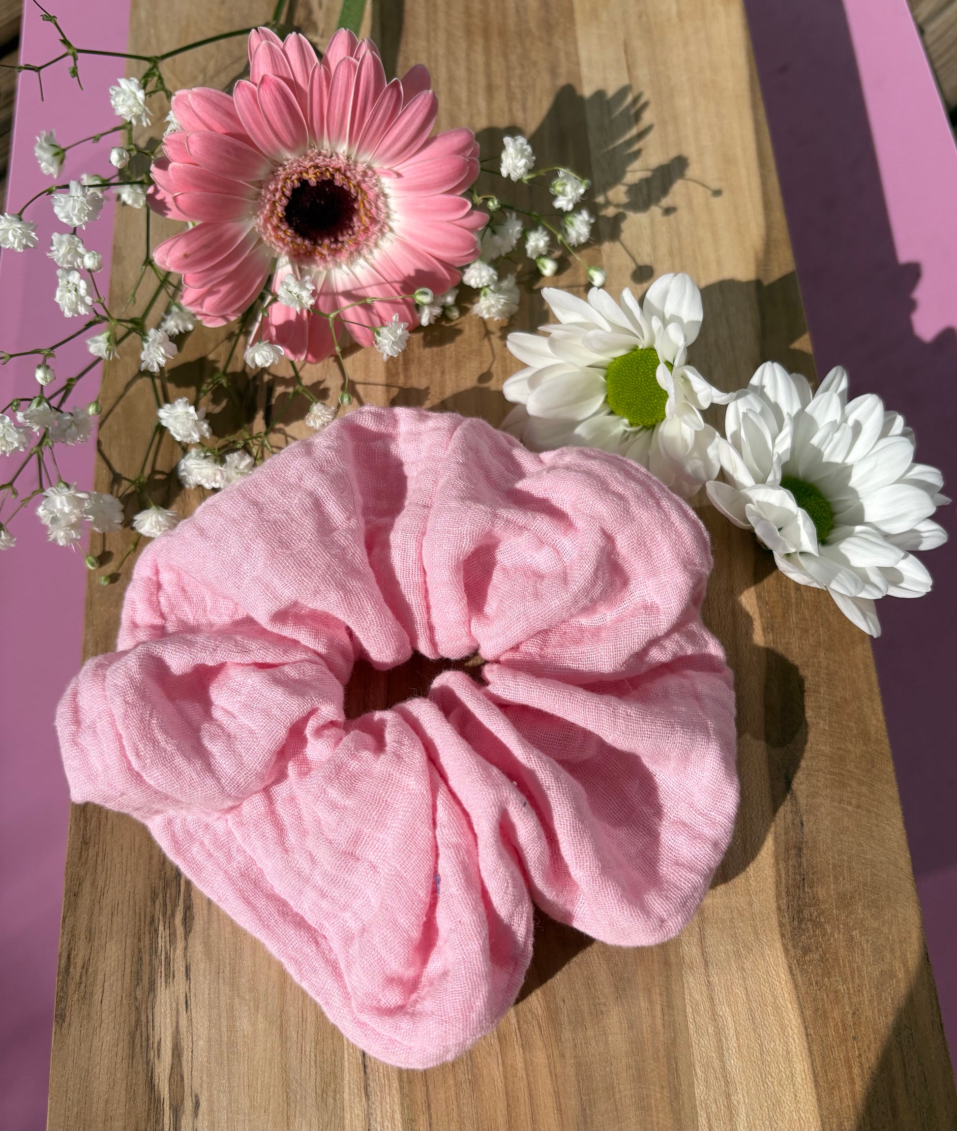 Craquez pour la tendresse du chouchou “Ambre” ! Avec sa teinte rose pastel ultra douce et son tissu en double gaze de coton, il apporte une touche sucrée à vos coiffures — comme un bonbon dans les cheveux 🍬