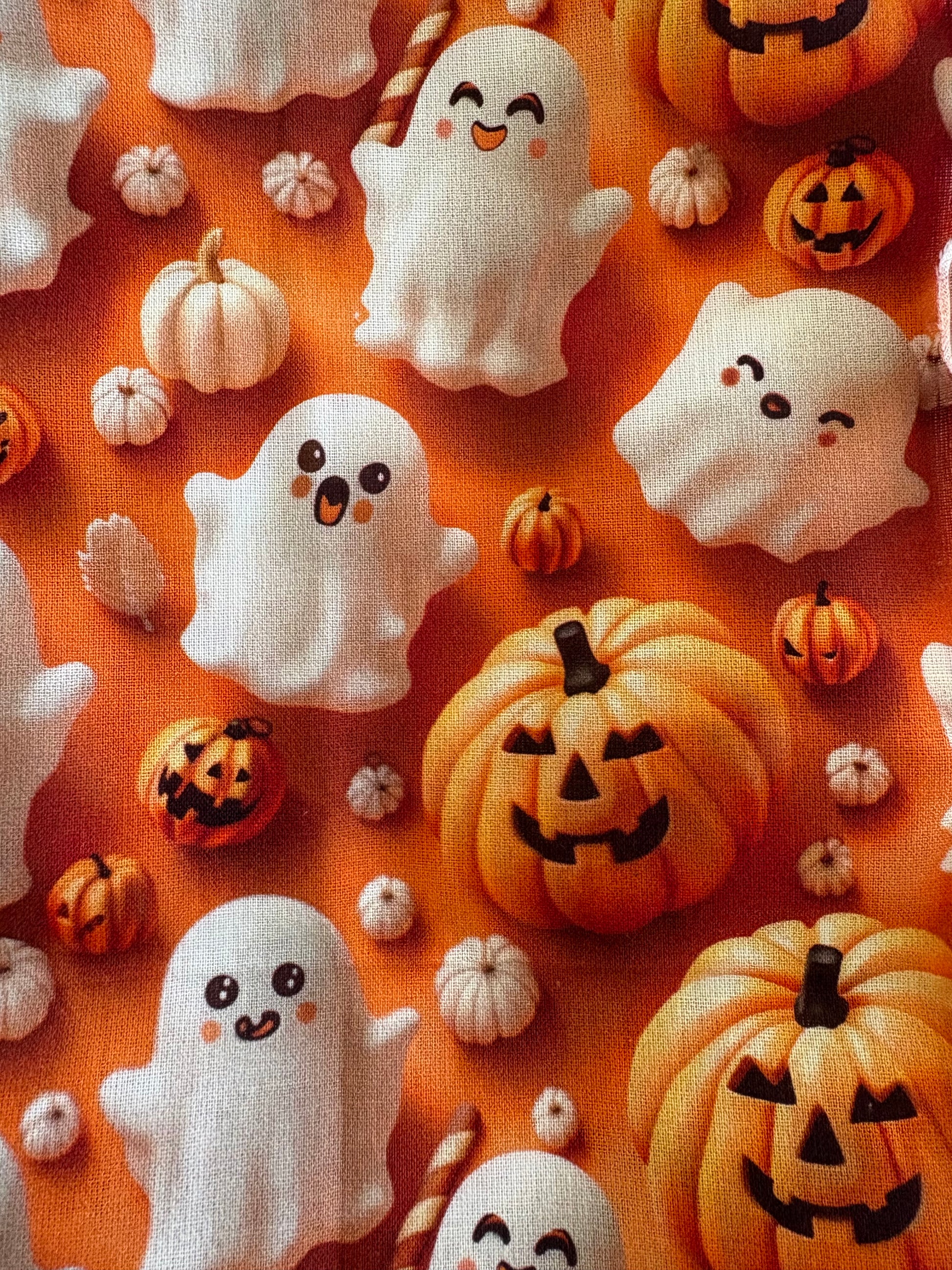 Plonge dans l’esprit d’Halloween avec ce chouchou plein de peps ! Son tissu orange vif, orné de petits fantômes et de citrouilles souriantes, apporte une touche festive et joyeuse à ta coiffure.