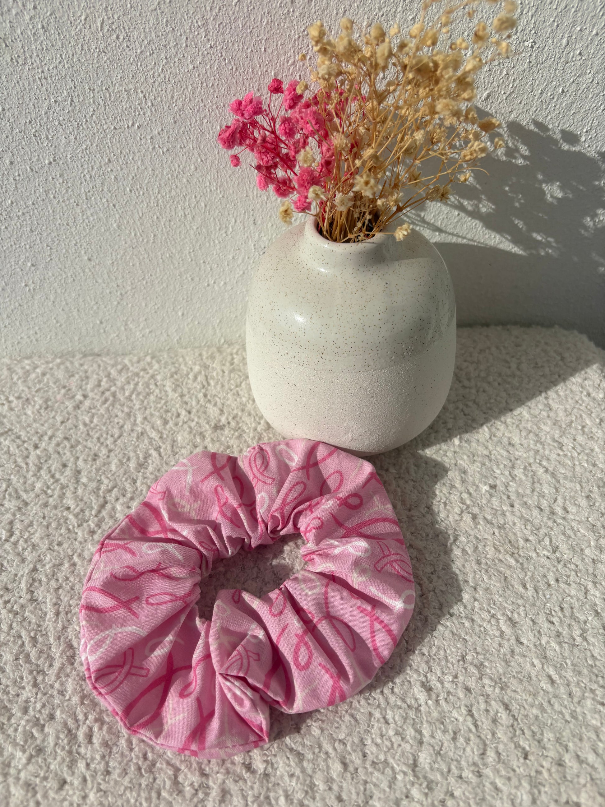 Un accessoire plein de sens et de douceur 🌸 Ce chouchou rose orné du ruban symbole d’Octobre Rose est bien plus qu’un simple accessoire pour cheveux : il représente le soutien, la solidarité et l’espoir dans la lutte contre le cancer du sein.