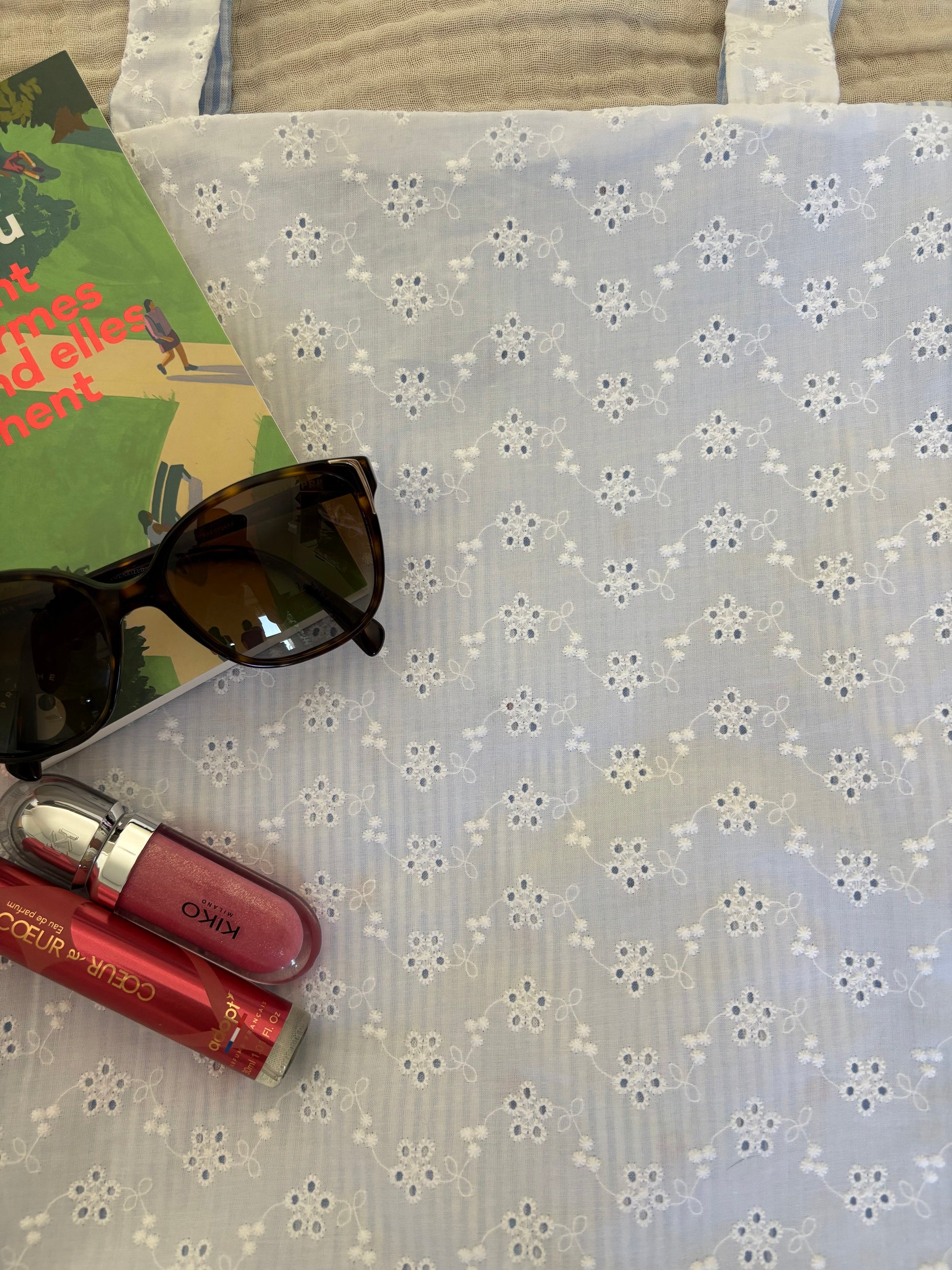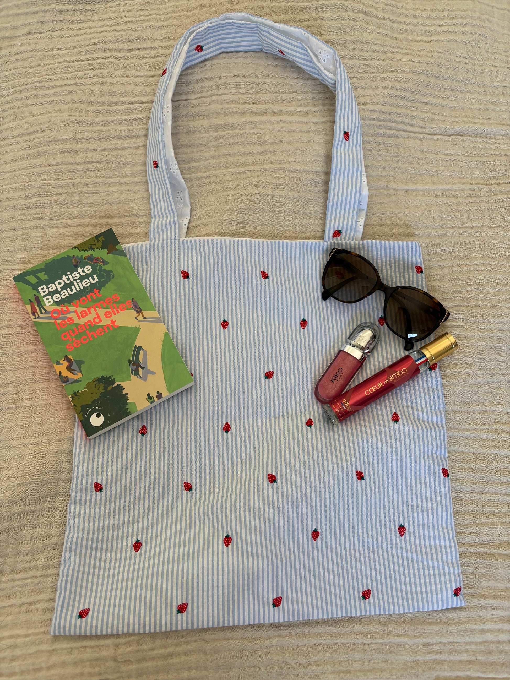 Craquez pour ce tote bag 2-en-1 aussi charmant que pratique ! D’un côté, un tissu rayé bleu ciel brodé de petites fraises rouges pour une touche fruitée et vintage à souhait. De l’autre, une délicate broderie anglaise blanche, élégante et romantique 💭